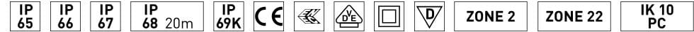 Putkivalaisin (Ø 60 mm) räjähdysvaarallisiin tiloihin (tilaluokat 2 ja 22). Kotelointiluokka IP69K, iskunkestävyysluokka IK10, suojausluokka II. Keskileveä valonjako. Käyttölämpötila-alue -25°C … +40°C.
