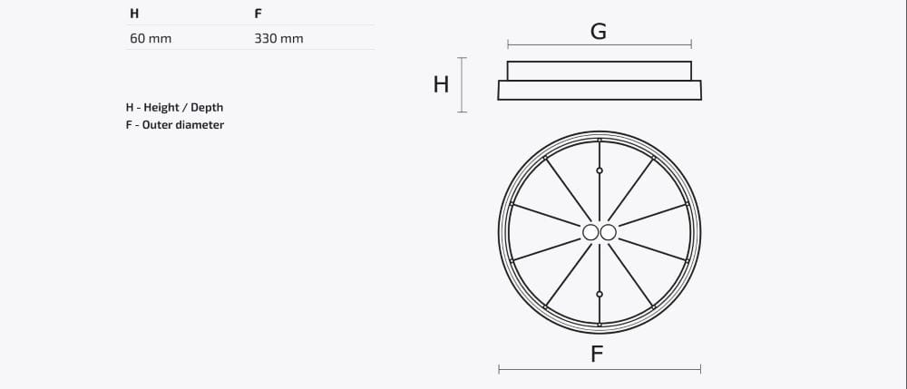 Runko valmistettu iskunkestävästä ja UV-suojatusta PC-muovista: harmaa, valkoinen ja musta. Suojakupu opaali PC. Valaisimen halkaisija 330mm, korkeus 60mm.