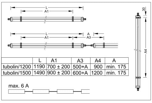 Kaksi runkopituutta (1190mm ja 1490mm). Opaloitu suojaputki. Valaisimen pantakiinnitys mahdollistaa valaisinta kääntämällä valon suuntaamisen epäsymmetrisesti. Toimitukseen sisältyy kaksi (2) pantaa per valaisin.