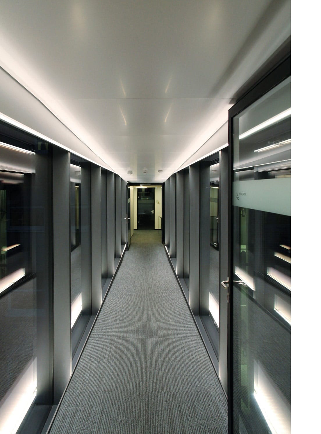 Valaisinrunko alumiiniprofiilia, anodisoitu alumiini (vaaleanharmaa). Suojalasina kirkas PMMA. Viimeistelty lasin sovitus saumattomasti valaisinrungon tasoon eliminoi lasin likaantumisen pölystä tai puunlehdistä ylöspäin asennettuna vuosienkaan kuluessa. Osassa malleista Fresnel linssi 6° (epäsymmetrinen), 30° (”keskitetty”) tai keskileveällä 60o valonjaolla. Valaisintoimitus sisältää kaksi pinta-asennuskiinnikettä kattoasennukseen (seinäkiinnikkeet lisätarvikkeena).