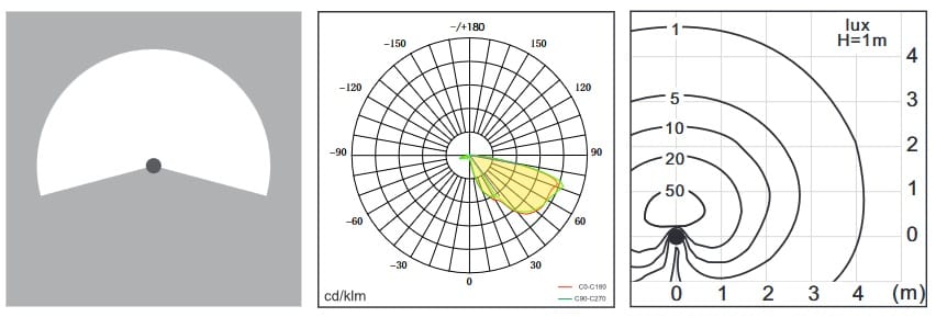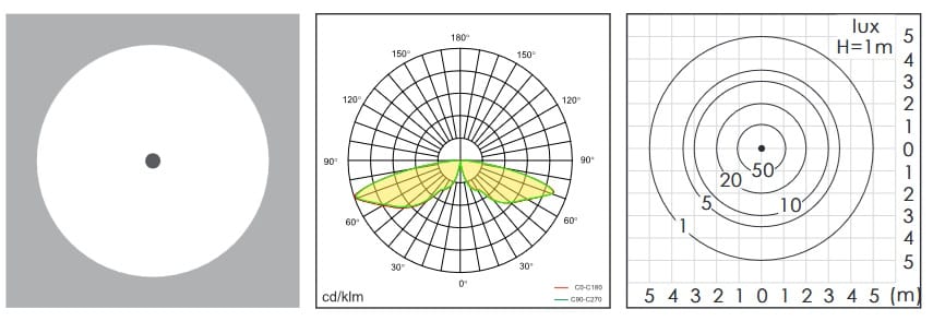 Runko pyöreää alumiiniprofiilia (ø180mm), valaisinosa ja pohjaosa alumiinivalua. Musta alumiiniheijastin. Linssioptikkaa.