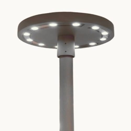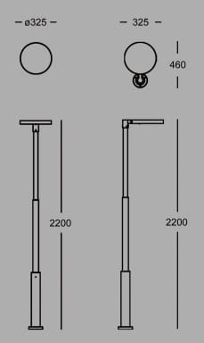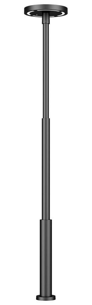 Pyöreä valaisinosa alumiinivalua, halkaisija 325mm, korkeus 50mm. Linssioptiikka. Kirkas suojalasi. Olakepylväs 2200mm, kapenee ylöspäin kolmessa osassa 100-80-60mm. Pintakäsittelynä tummanharmaa jauhemaalaus.